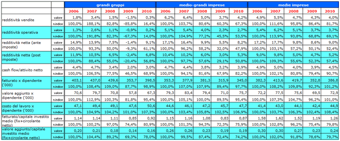2. l’occupazione e gli investimenti in attività fisse (tabella 1). Le medie imprese hanno ridotto meno sia i dipendenti (-1,2% rispetto al livello 2006 contro il –3,5% dei grandi gruppi e al –2,4% delle medio-grandi) che le ore lavorate: nel 2010 siamo all’87% del 2006 per le medie, contro l’84% dei grandi gruppi e il 79% delle medio-grandi. Dal 2009 tutti gli aggregati di imprese considerati riducono il tasso di investimento (gli investimenti fissi in percentuale dello stock), ma il taglio è più drastico per i gruppi maggiori (siamo al 63% del tasso di investimento del 2006), mentre lo è meno per le medie imprese (72% del tasso di investimento del 2006);