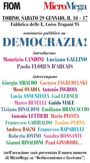 Gli interventi di Landini, Gallino, Ingroia, Flores d’Arcais, Zagrebelsky, Revelli e Iovino al seminario “Democrazia!” organizzato da Fiom e MicroMega (AUDIO)