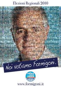 Prendete il caso del governatore della Regione Lombardia Roberto Formigoni, ricandidato a ricoprire il suo ruolo di potere alla guida della Regione per il quarto mandato consecutivo (un ventennio: un po’ sinistro, non vi pare?). Per la sua campagna elettorale, Formigoni ha scelto di addobbare le strade e le piazze di Lombardia con una gigantografia in cui la sua effigie si forma – come in una sorta di puzzle in equilibrio visivo su una dissolvenza incrociata – attraverso l’accostamento di centinaia e centinaia di foto-tessere che rappresentano evidentemente cittadini e/o elettori lombardi.
