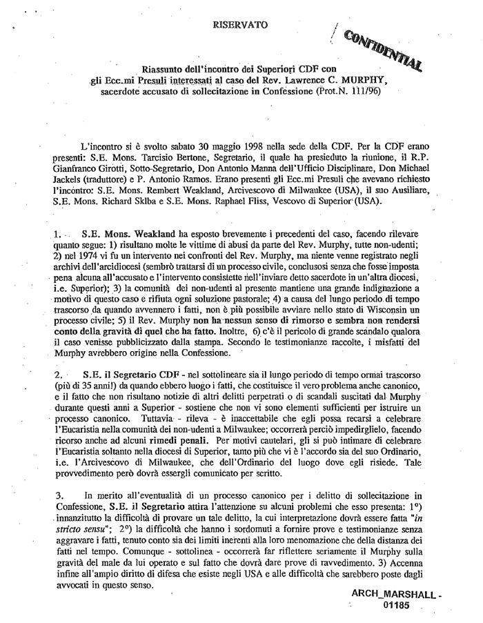 Il 30 maggio 1998, nella sede della Congregazione per la Dottrina della Fede, si incontrano il cardinale Bertone, monsignor Girotti, Don Antonio Manna dell’Ufficio Disciplinare, padre Antonio Ramos con monsignor Weakland, arcivescovo di Milwaukee, il suo vescovo ausiliare, monsignor Skiba, e monsignor Fliss, vescovo di Superior.