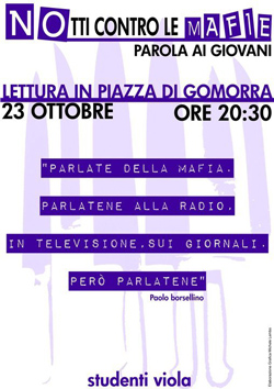 Dal 23 ottobre inizieranno le “Notti contro le mafie. Parola ai giovani”, l’iniziativa organizzata da gruppi di giovani Viola da nord a sud. Si tratta di serate che, incentrate sulla lettura di opere, fatti e testimonianze, intendono portare tra la gente il tema della lotta alla criminalità organizzata, una volta al mese. Si inizierà dunque con una lettura di Gomorra simultanea e promossa dai gruppi viola sparsi lungo lo stivale e pronta a partire in più di dieci città italiane.