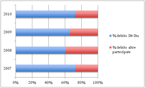 Distribuzione del debito del “sistema partecipate” in termini percentuali (2007-2010)