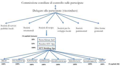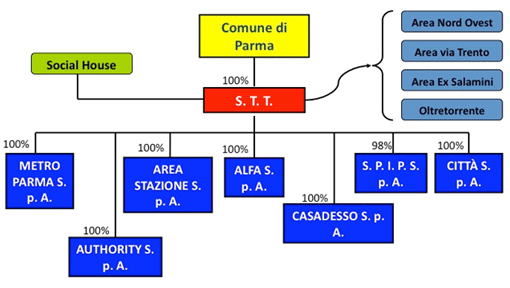 [21] Stt risulta, oggi, detentrice del 100% del capitale sociale di Alfa srl (in liquidazione), Stu Stazione spa, Stu Authority spa, CasAdesso spa, Città delle Scienze srl (in liquidazione), Metro Parma srl (in liquidazione), Parma Sviluppo srl e Spip srl (in liquidazione). Le uniche due società di scopo estranee al controllo di Stt sono ParmAbitare scrl e Stu Pasubio spa.