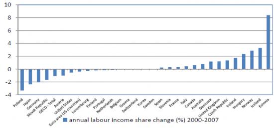 Grafico 1 – Cambiamenti della quota del lavoro sul reddito, anni 2000-2007, media annuale per paesi Ocse (fonte: nostre elaborazioni su Oecd statistics, Economic Outlook, maggio 2014)