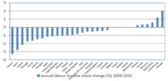 Grafico 2 – Cambiamenti della quota del lavoro sul reddito, anni 2008-2015, media annuale per paesi Ocse (fonte: nostre elaborazioni su Oecd statistics, Economic Outlook, maggio 2014, per 2014 e 2015 previsioni Oecd)