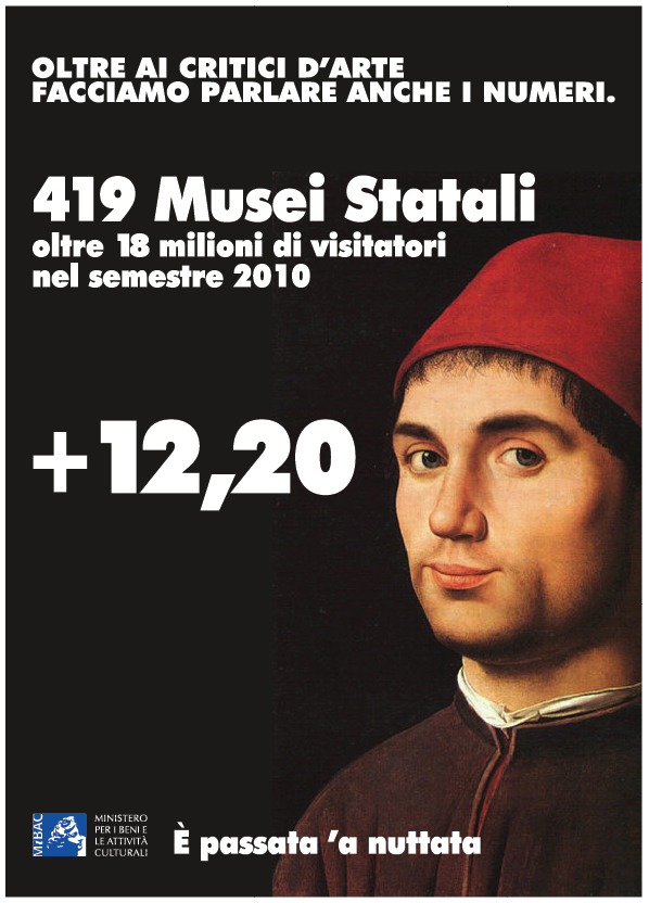 Il primo compleanno della Direzione Generale per la Valorizzazione del Ministero per i Beni e le Attività Culturali, il 29 luglio, è stato festeggiato da una campagna mediatica suggellata da un manifesto dove uno dei più celebri volti dipinti da Antonello da Messina sembra sorridere alle cifre trionfalmente snocciolate dal testo, in sparatissimo bianco su fondo nero: i 419 musei statali italiani sono stati visitati da oltre 18 milioni di persone nel primo semestre 2010, con un incremento del 12,20 % rispetto al primo semestre 2009. Comprensibile che il giovanotto dal berretto rosso sorrida, tanto che a lui potrebbe riferirsi, come un fumetto, la battuta napoletana che compare a guisa di commento accanto al marchio del Mibac: è passata a’ nuttata. Lasciamo perdere la raffinatezza del tutto per leggere l’altro commento, evidente premessa metodologica dei bruti dati: oltre ai critici d’arte, facciamo parlare anche i numeri. Frase un po’ ambigua, perché facciamo potrebbe essere indicativo come imperativo, ma il succo non è in discussione: i critici (mai che si parli di “storici” come sarebbe più corretto) potranno dire quel che vogliono, ma a contare davvero sono i numeri. Cioè, visitatori, incassi, indotto. Peccato che in questo caso i “critici” non siano stati gran che interpellati. Altrimenti avrebbero rilevato l’evidente taroccamento di un’immagine che nell’originale non sorride affatto (concediamo che si tratti di un calibrato divertissement grafico. Ma chissà in quanti se ne sono accorti). E ancora la scelta paradossale di una campagna che associa il ritrovato vigore dei musei statali a un dipinto che non si trova neppure in Italia, giacché sta nella National Gallery di Londra.