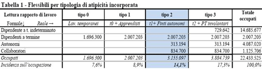 La tabella 1 mostra i diversi gradi di atipicità presenti nell’occupazione (lettura formale), raggruppati in aggregati che tengono conto della effettiva prestazione lavorativa (lettura reale). L’aggregato tipo 2, che rappresenta la dimensione della flessibilità contrattuale più accreditata, si è ridotta in 24 mesi dal 15,8 (2008) al 14,1 per cento (2010) dell’occupazione. Il miglioramento è stato solo apparente, poiché ha sotteso la silenziosa fuoriuscita di quasi mezzo milione di lavoratori flessibili. In un certo senso, lo strumento della flessibilità ha risposto egregiamente alla sua missione, ovvero ha agevolato l’ingresso nel mercato del lavoro, ma anche l’uscita dallo stesso, così da consentire il più facile adattamento del fattore lavoro alla produzione. Tuttavia, le caratteristiche della flessibilità cattiva (discontinuità, sottoccupazione, disoccupazione, eccetera.) sono sempre più un problema, con conseguenze presenti (bassi redditi, bassa fecondità, ecc.) e future (modesti assegni pensionistici). Tutto ciò appare ancor più preoccupante alla luce del fatto che ai più coinvolti (i giovani) verrà applicata, da subito, la riforma previdenziale, in cui i benefici pensionistici sono proporzionali alla reale contribuzione.