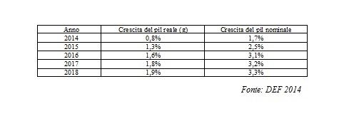 A questo punto, prendiamo come riferimento il Documento di Economia e Finanza (DEF) varato nell’aprile scorso dal governo Renzi. Il DEF assume le seguenti previsioni sul Pil reale e nominale del Paese:
