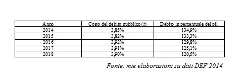 Da questi dati si può agevolmente desumere che il DEF giunge alla determinazione di un differenziale positivo tra costo del debito e crescita nominale[2]. In particolare, il differenziale risulterebbe essere superiore a un punto nel 2014, per poi ridursi a circa mezzo punto nei due anni successivi: