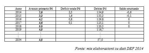 Si tratta di un quadro che condurrebbe ad abbattere il debito pubblico di circa 15 punti, al 120,5% del Pil, a fine legislatura (2018) e porterebbe il debito pubblico sotto il 60% del Pil in 20 anni (nel 2034 si arriverebbe a un rapporto tra debito e pil del 57%). Come si osserva, quindi, il DEF prevede di cogliere l’obiettivo dell’abbattimento del debito al 60% in 20 anni ed anche di realizzare il pareggio di bilancio in termini strutturali (al netto cioè delle variazioni cicliche), secondo quanto previsto dalla disciplina del Fiscal Compact (l’obiettivo sarebbe conseguito nel 2016).
