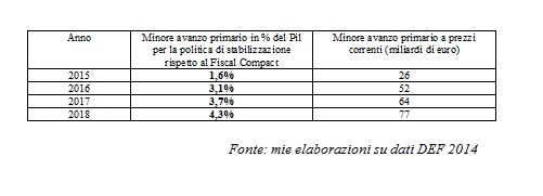 La differenza tra le due politiche è estremamente significativa. Già il prossimo anno una semplice politica di stabilizzazione consentirebbe di avere maggiori risorse a disposizione, per riduzioni di tasse e aumenti di spesa pubblica, per 26 miliardi. Una maggiore disponibilità di risorse che nel 2018, anno finale della legislatura, raggiungerebbe i 77 miliardi di euro. Si noti che l’avanzo primario che il Fiscal Compact imporrebbe alla luce delle ipotesi governative nel 2018 raggiungerebbe la cifra stratosferica di 90 miliardi di euro[4].