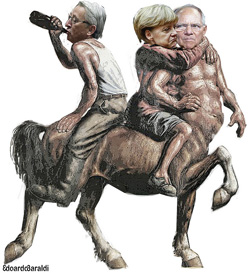 Da queste rovine (che un tempo erano speranze, sogni, utopie, solidarismo cattolico, liberalismo democratico e internazionalismo socialista), da questa Europa in mille pezzi (divide) ora la Germania (con i suoi satelliti ideologici) potrà esercitare la sua egemonia economica e culturale (et impera), avendo in mano anche la tecnocrazia di Bruxelles; potrà costruire un’Europa finalmente disciplinata, sottomessa e obbediente, tutta l’Europa del Nord e ora anche del Sud avendo oggi pienamente interiorizzato la modalità ordoliberale (& neoliberista) di organizzazione di una società nella forma totalitaria tedesca, dove il debito (degli altri) è sempre una colpa, dove il beruf, la vocazione di ognuno deve essere oggi la flessibilità, dove l’essenza di ciascuno è solo quella di essere soggetto economico, quindi capitale umano e di sapersi adattare velocemente al mercato (la flessibilizzazione del mercato del lavoro e la libertà di licenziamenti collettivi imposti nuovamente ad Atene). Merkel e Schäuble e la maggioranza dei tedeschi con loro, non hanno sopportato l’esito del referendum greco del 5 luglio, anzi li ha fatti incattivire ancora di più e si sono comportati come bambini viziati e capricciosi, strillando e picchiando i pugni sul tavolo e battendo i piedi per terra e facendo la faccia feroce con i compagni di gioco pur di ottenere ciò che volevano. Incapaci di accettare che qualcuno potesse contestare il giocattolo – l’austerità – già rotto e fin dall’inizio malfunzionante, ma necessario in dosi crescenti per adattare appunto gli europei alle logiche super-razionali del mercato.