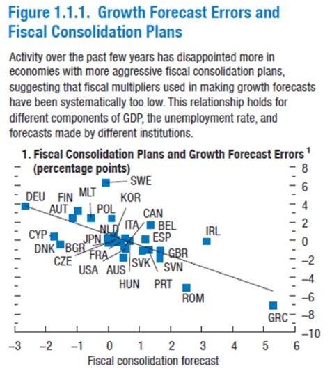 Nel caso italiano, se il moltiplicatore fosse 0,5, la manovra del “Salva-Italia” (22,5 miliardi, 1,4% del Pil) avrebbe ottenuto l’auspicata riduzione del rapporto deficit/Pil (-1%), con una perdita complessiva di -0,7% del Pil: scenario coerente con le previsioni del dicembre 2011. Nel caso invece di moltiplicatori intorno a 1,5 una manovra di 22,5 miliardi riduce il deficit di solo 0,35% del Pil e per ottenere il rapporto deficit/Pil desiderato bisognerebbe inseguire l’obiettivo con ripetute manovre di austerità, per importi complessivi superiori a 50 miliardi, infliggendo al Pil un -6,5% ovvero la caduta del Pil in Grecia in questi anni.
