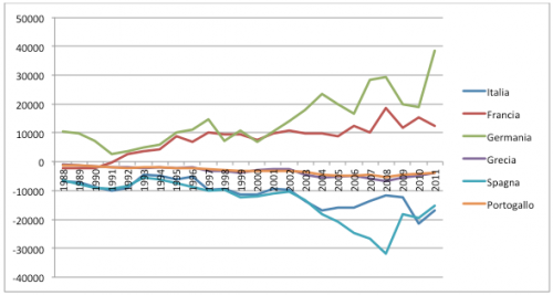 La situazione dell’Italia – coerente in tendenza con quella degli altri paesi della periferia d’Europa – appare oltremodo critica, tenuto conto della sua dimensione economica e del ruolo portante tradizionalmente rivestito nella sua struttura produttiva dal settore manifatturiero . La crisi di competitività italiana – come già diffusamente ricordato nei precedenti interventi di Pietro Greco e di Sergio Ferrari – è ben antecedente all’attuale crisi e viene da lontano, esprimendo il mancato adattamento del sistema produttivo ai nuovi paradigmi dell’innovazione tecnologica. L’assenza di interventi di politica industriale tesi a riconfigurare la specializzazione produttiva dell’Italia verso settori a maggior intensità tecnologica, ha col tempo reso sempre più oneroso il deficit commerciale derivante dagli scambi di prodotti high-tech del nostro Paese. L’onere – per così dire – strutturale di importazioni di beni ad alta tecnologia del tutto “fisiologiche” per un paese industriale avanzato quale è il nostro, è stato – soprattutto a partire dalla seconda metà degli anni ’80 – sempre meno compensato dalle esportazioni, mentre a livello di bilancia manifatturiera complessiva ha iniziato a pesare la minor domanda mondiale rivolta ai prodotti di tipo “tradizionale”, con l’aggravante che dopo l’entrata nell’euro non è stato più possibile mettere mano a manovre svalutative e sempre maggiori si sono fatte le pressioni sul mercato del lavoro, favorendo la precarizzazione dell’occupazione e di qui la spinta al ribasso sui salari per recuperare in competitività. La crisi competitiva dell’Italia –nel confronto con i maggiori paesi europei e con le economie del Nord – Europa – come già ricordato nei precedenti interventi – si è configurata come “crisi specifica”, che non può, evidentemente, non gravare sull’esito della crisi più generale che sta investendo l’Europa tutta. Ma sarebbe errato non circoscriverla entro i caratteri che le sono propri e che – come visto – alimentano “strutturalmente” l’onere del debito estero.
