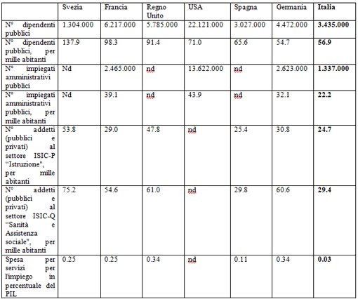 Tabella 1. Alcuni dati comparativi. I dati si riferiscono a tutti i livelli di amministrazione e non includono il personale militare. Fonte OECD. Prime quattro righe, 2011; le altre 2012.