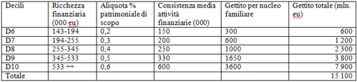 Tabella 2. Ipotesi di gettito della patrimoniale di scopo sulle attività finanziarie. (2,28 milioni di famiglie per ciascun decile della distribuzione: i primi 5 decili sono esenti).