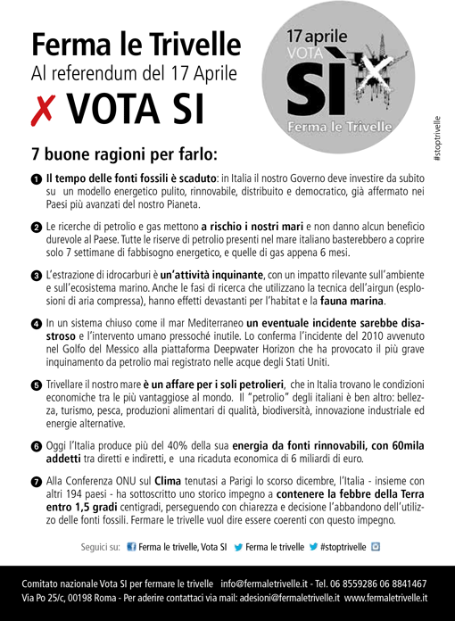 Il 17 aprile si voterà per il "referendum anti-trivelle" promosso da dieci regioni italiane. Verrà chiesto ai cittadini italiani se bloccare o meno il rinnovo automatico "per tutta la durata di vita utile del giacimento" delle concessioni petrolifere entro le 12 miglia dalla costa.