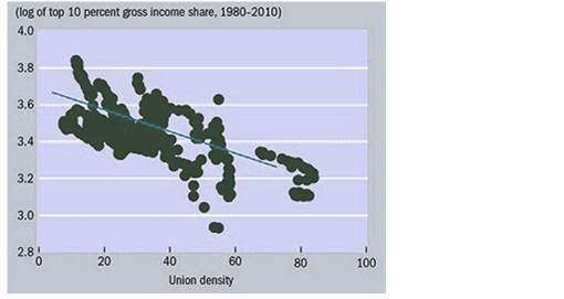 Si tratta di provvedimenti la cui ratio risiede, in ultima analisi, nel dequalificare la forza-lavoro e renderla disponibile a bassi salari. Affinché ciò si renda pienamente possibile, è necessario ridurre ulteriormente il potere contrattuale del sindacato. La figura 1 stabilisce che la riduzione della union density e dunque del potere contrattuale del sindacato si è tradotta, nei Paesi OCSE, in un significativo aumento dei redditi percepiti dal 10% delle famiglie con più alto reddito. L’Italia è ovviamente all’interno di questa dinamica, ma con una propria specificità, ovvero il fatto che, rispetto alla media europea, il numero di iscritti al sindacato è ancora relativamente elevato. Letto in questa chiave, il fondamentale compito del Governo Renzi consiste nell’impedire qualunque forma di conflittualità sociale e di resistenza organizzata, incentivando i giovani disoccupati all’autoimprenditorialità e passando a un sistema di relazioni industriali di tipo ‘atomistico’, vincolando l’intermediazione del sindacato.