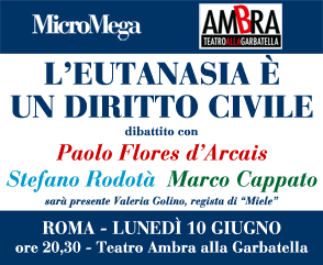 Un atto di libertà, una scelta individuale ma anche argomento che deve interessare la collettività nel suo complesso e la politica. In concomitanza del nuovo numero “” e della raccolta firme per una legge di iniziativa popolare, la rivista MicroMega – in collaborazione con il Teatro Ambra alla Garbatella – organizza un dibattito sull’eutanasia lunedì 10 giugno ore 20,30 presso, appunto, il Teatro Ambra alla Garbatella (piazza Giovanni da Triora 15, Roma).