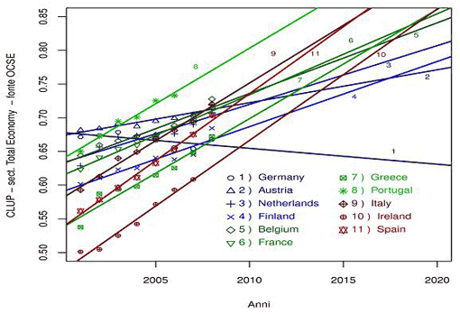 La figura mostra l’andamento effettivo dei costi monetari del lavoro per unità di prodotto fino al 2007, e dopo quell’anno descrive la loro proiezione lineare per gli anni successivi. Dal grafico si evince che se le linee di tendenza che hanno caratterizzato il primo decennio della zona euro venissero confermate anche in futuro, la divaricazione tra i costi assumerebbe ben presto dimensioni eccezionali. In particolare, il costo unitario del lavoro in Germania diminuirebbe in termini assoluti a fronte di incrementi estremamente accentuati in Irlanda, Spagna, Italia, Grecia e Portogallo. In pochi anni la forbice tra i costi sarebbe dunque tale da generare divari di competitività senza precedenti. Essa potrebbe quindi condurre a quella che Krugman (1995) ha definito una “mezzogiornificazione” delle periferie europee, vale a dire desertificazioni produttive e migrazioni di massa dalle aree più deboli dell’Unione. Vi è chi reputa questa eventualità una conseguenza logica del processo di centralizzazione dei capitali europei in atto da tempo, e della connessa tendenza alla “egemonizzazione tedesca” dell’Europa. Se così fosse si tratterebbe di un processo altamente rischioso, che potrebbe a un certo punto pregiudicare la sopravvivenza stessa dell’attuale Unione monetaria.
